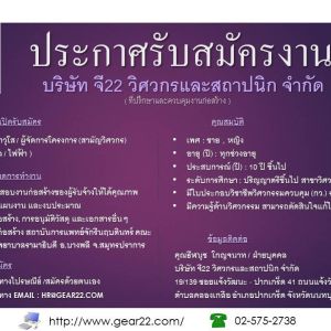 บริษัท จี22 วิศวกรและสถาปนิก จำกัด เปิดรับสมัครงานหลายอัตราติดต่อสอบถามข้อมูลเพิ่มเติมได้ที่ : คุณธีฬนุช โกญจนาทบริษัท จี22 วิศวกรและสถาปนิก จำกัดเลขที่ 19/139 ซอยแจ้งวัฒนะ-ปากเกร็ด 41 ถนนแจ้งวัฒนะตำบลคลองเกลือ อำเภอปากเกร็ด จังหวัดนนทบุรี 11120E-mail :