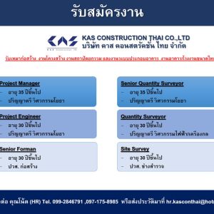 บริษัท คาส คอนสตรัคชั่น ไทย จำกัดประกาศรับสมัครงาน หลายอัตรา- Project Manager- Senior Quantily Surveyor - Preject Engineer - Quantily Surveyor- Senior Forman- Site Surveyสนใจติดต่อ คุณโน๊ต (HR) โทร.099-284-6791, 097-175-8985 หรือส่งประวัติมาที
